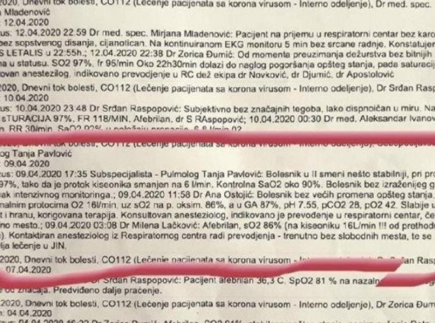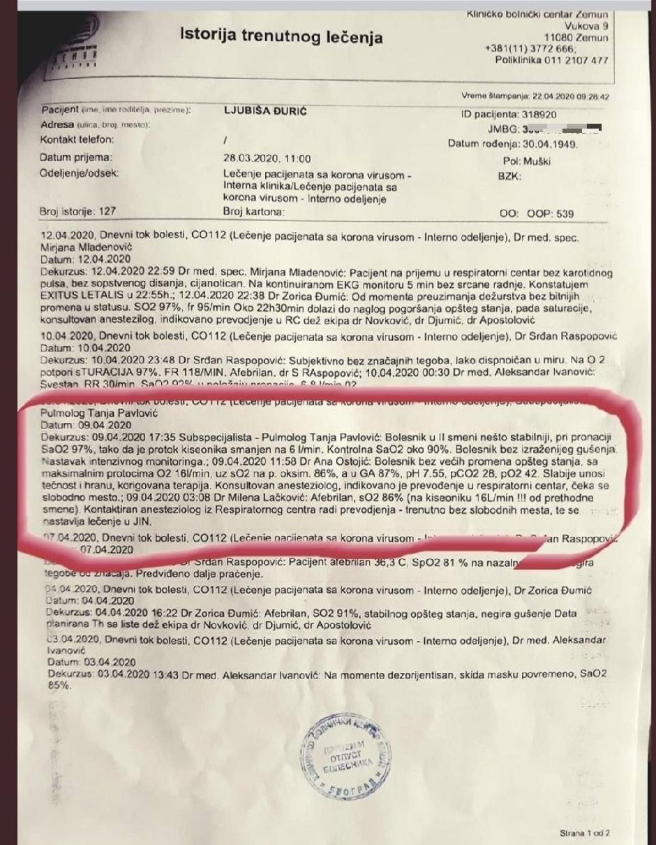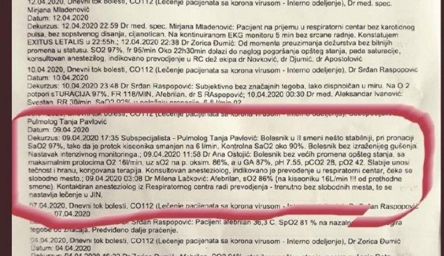 U međuvremenu, Đurić je objavio papir sa historijom lečenja gdje piše da se čeka slobodno mjesto u respiratornom centru i tako demantovao i Lončara i Vučića.