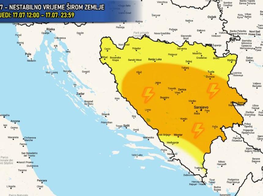 U dijelovima centralne, istočne, sjeveroistočne Bosne te na sjeveru Hercegovine moguće nevrijeme uz veće količine padavina u kratko vrijeme, led i pojačan vjetar.