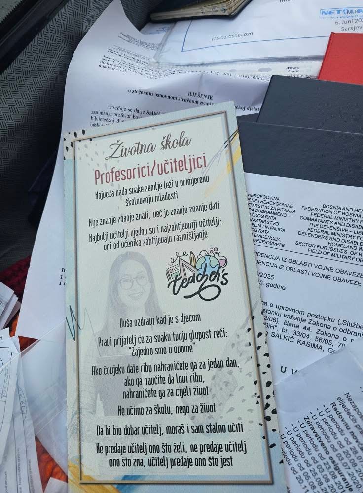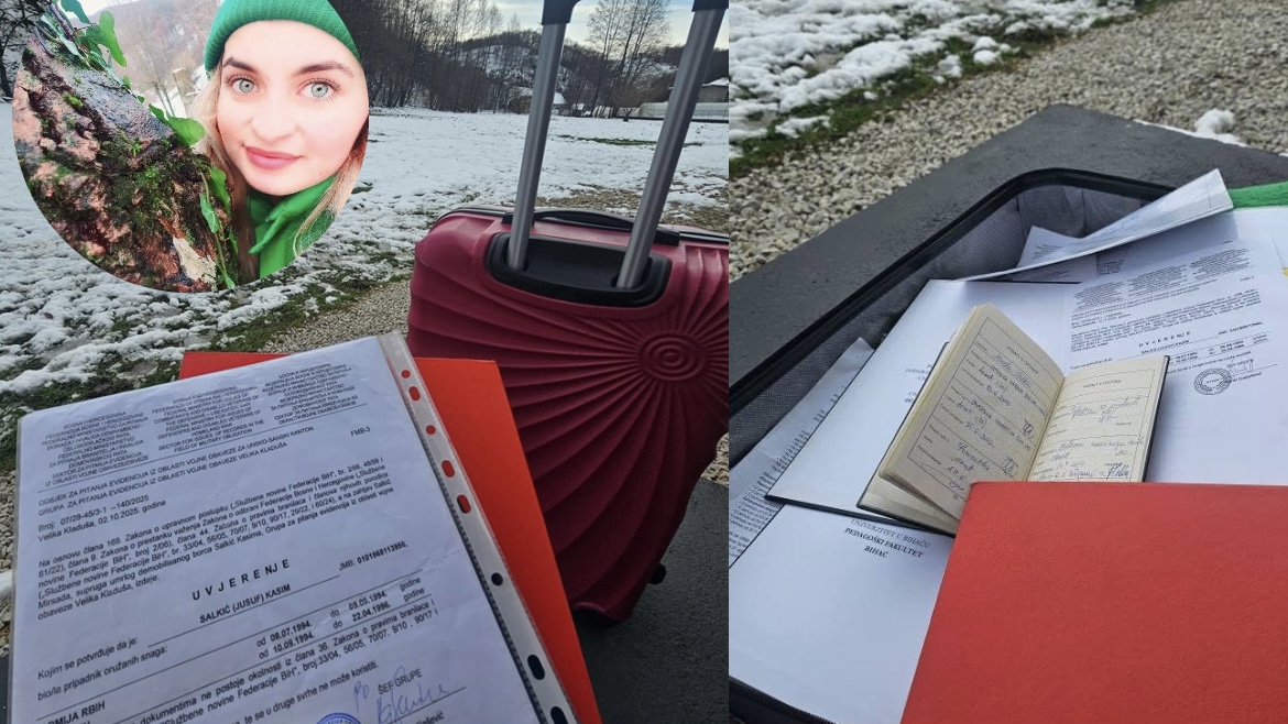 Na svom Facebook profilu, profesorica Mirela Salkić iz Velike Kladuše objavila je ispovijest koja je dirnula hiljade ljudi. U snijegu, ispred kuće, stoji kofer. U njemu, piše Mirela, nalazi se cijeli njen život: diplome, certifikati, indeks pun desetki, plaketa zlatnog studenta… I jedan dokument koji najviše boli – uvjerenje da je dijete demobilisanog umrlog borca, Salkić Kasima.