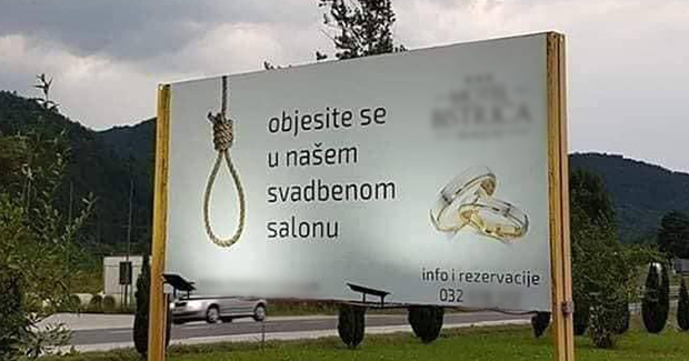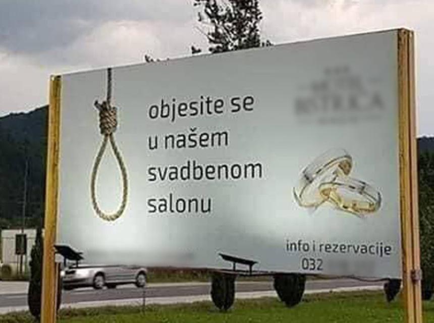 Da zlo u ovom slučaju bude veće, "domišljati" ugostitelj aminovao je da se na reklamu za iznajmljivanje prostora za svadbena veselja stavi i omča... vjerovatno da bi naivnima pojasnio kako se treba objesiti.