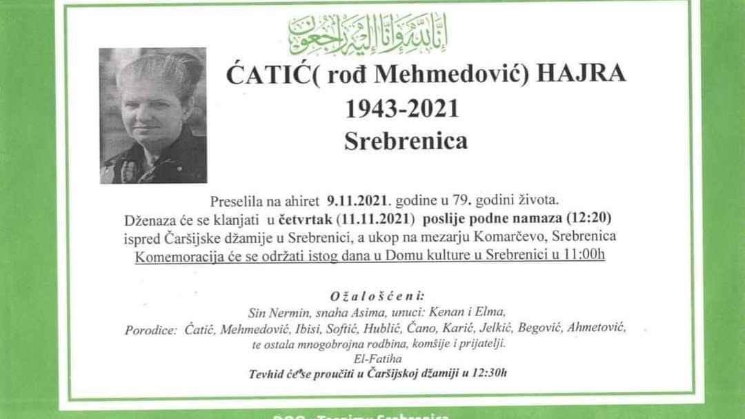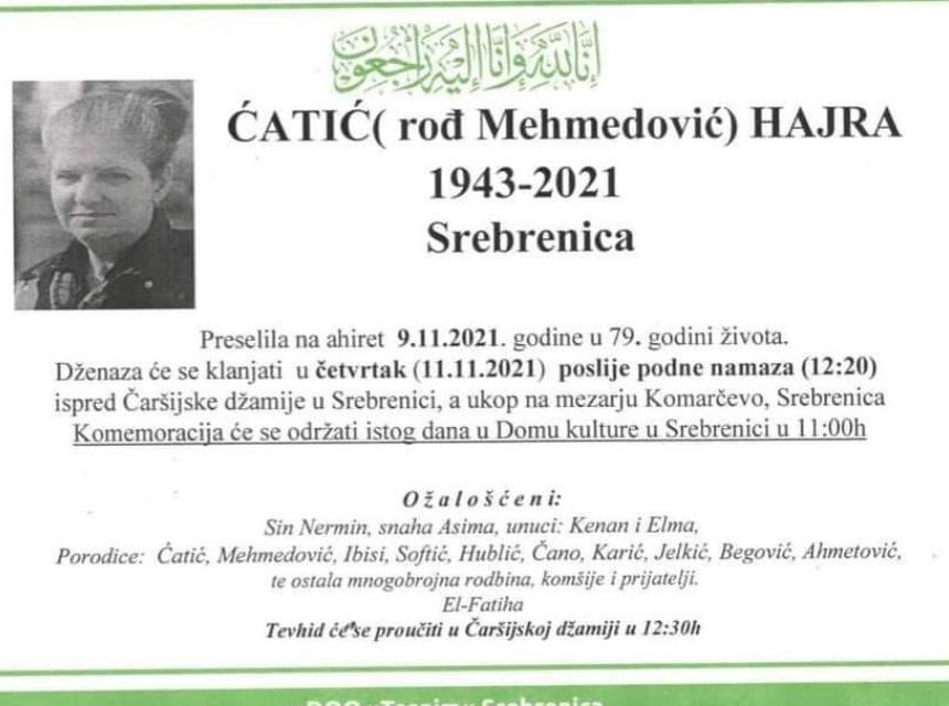 Hajra Ćatić, predsjednica Udruženja "Žene Srebrenice" i srebrenička majka koja nije uspjela pronaći posmrtne ostatke sina Nihada, preminula je u utorak, 9. novembra 2021. godine, u Sarajevu.