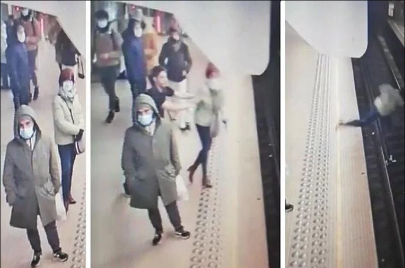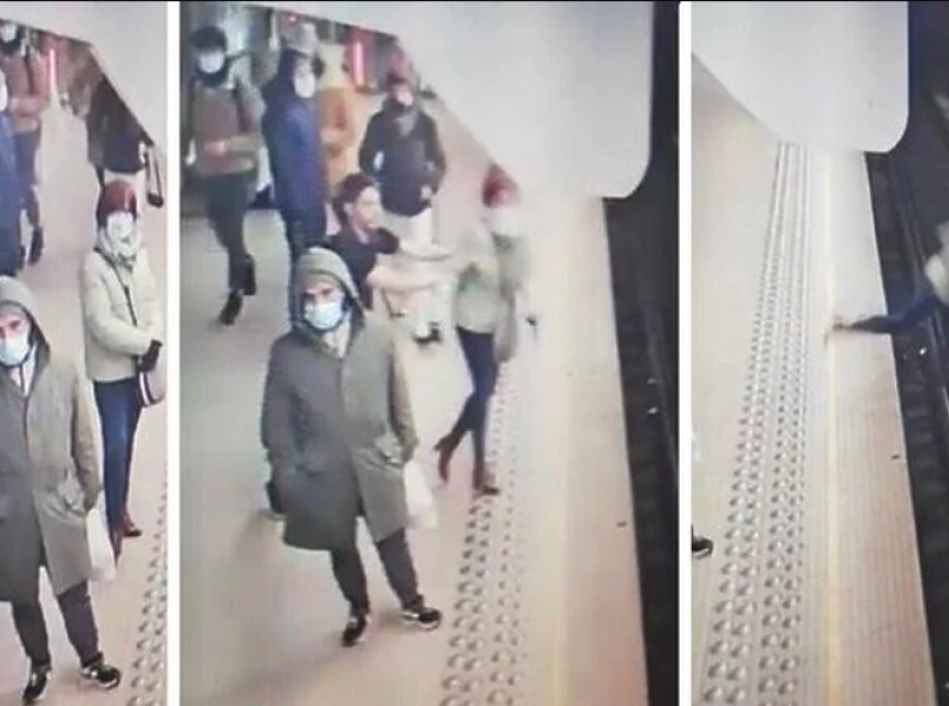 Kako je vidljivo na videozapisu, muškarac je ženu gurnuo na šine u trenutku dok je voz ulazio u stanicu, međutim, na svu sreću vozač je uspio zakočiti na vrijeme tako da je tragedija za dlaku izbjegnuta.