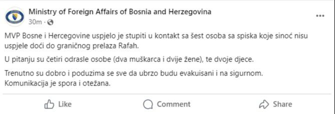 Šest osoba se nije pojavilo. Kako navode iz Ministarstva vanjskih poslova BiH, uspjeli su stupiti s njima u kontakt.