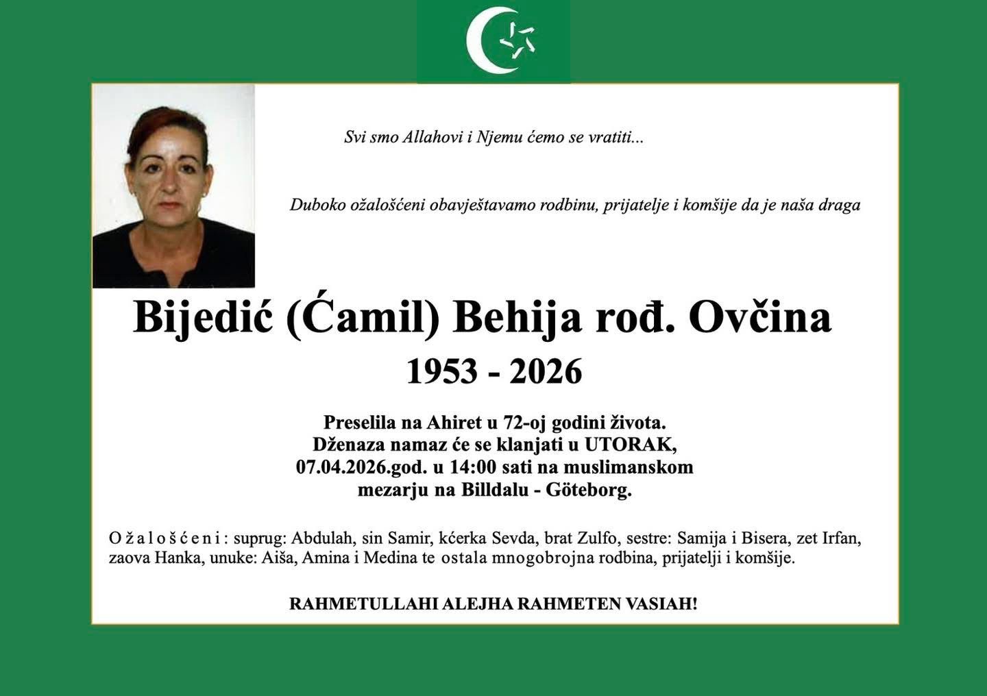Dženaza namaz će se klanjati u UTORAK, 07.04.2026. god. u 14:00 sati na muslimanskom mezarju na Billdalu – Göteborg.