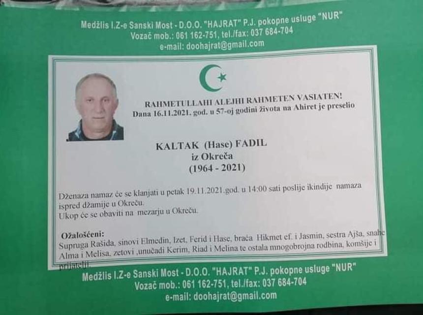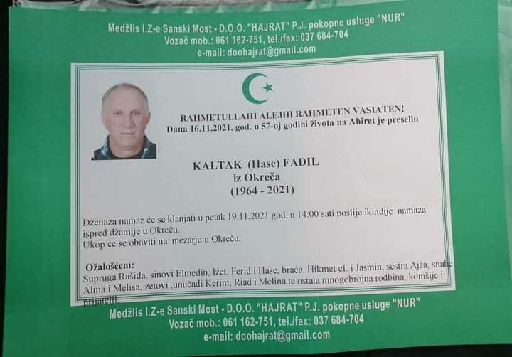 Tužnog srca i s bolom u duši obavještavamo rodbinu, komšije i prijatelje da je naš dragi Kaltak (Hase) Fadil, dana 16.11.201. godine, u 57-oj godini života, preselio na Ahiret.