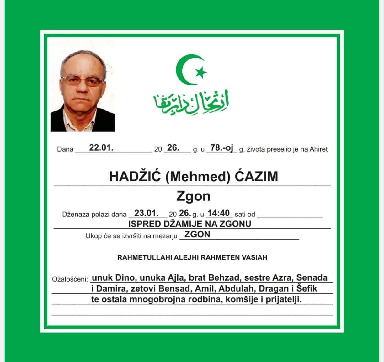 Dženaza polazi dana 23.01.2026. godine u 14:40 sati ispred DŽAMIJE NA ZGONU