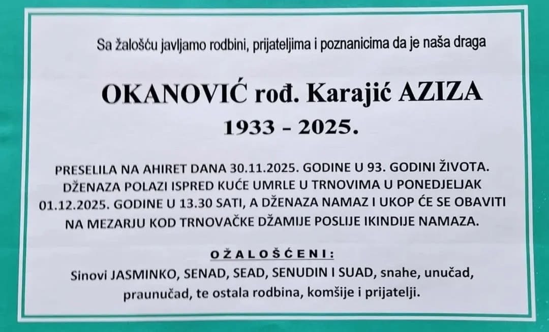 Dženaza polazi ispred kuće umrle u Trnovima u ponedjeljak 01.12.2025. godine u 13:30 sati, a dženaza namaz i ukop će se obaviti na mezarju kod Trnovačke džamije poslije ikindije namaza.