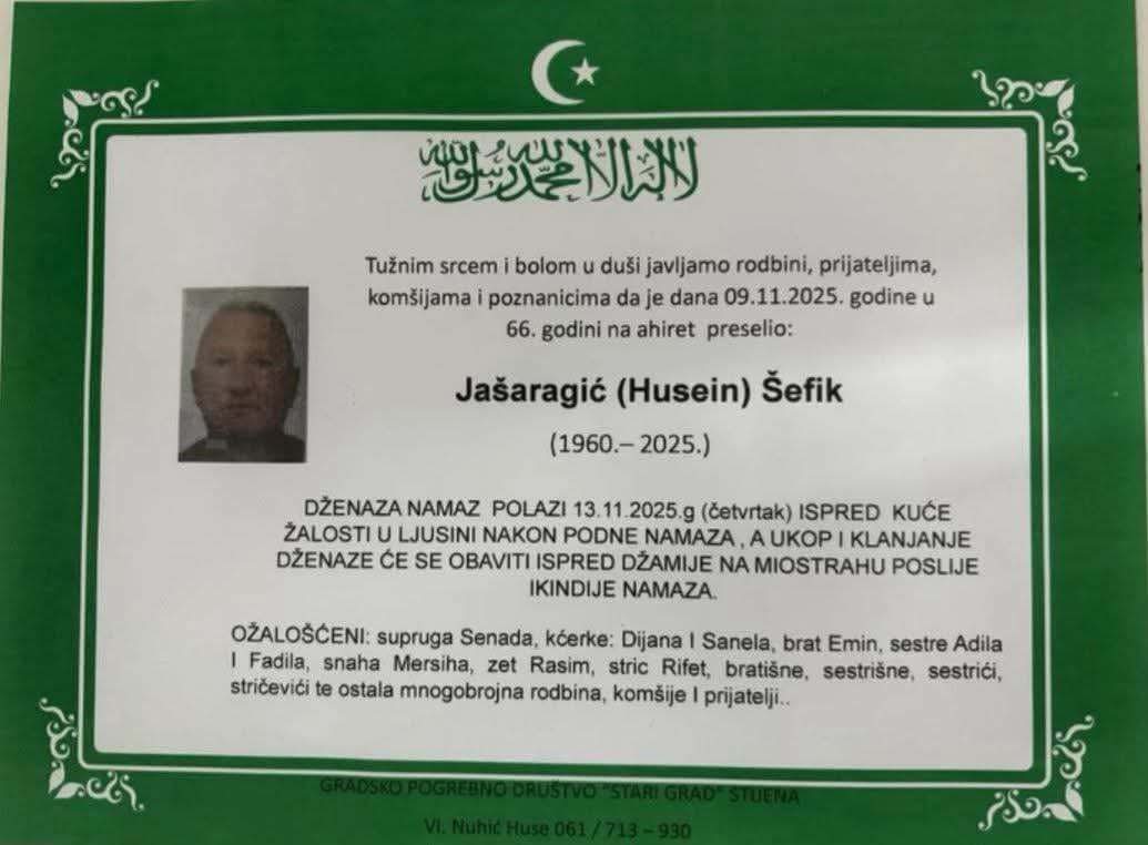 Dženaza namaz polazi 13.11.2025. g (četvrtak) ispred kuće žalosti u Ljusini nakon podne namaza, a ukop i klanjanje dženaze će se obaviti ispred džamije na Miostrahu poslije ikindije namaza.