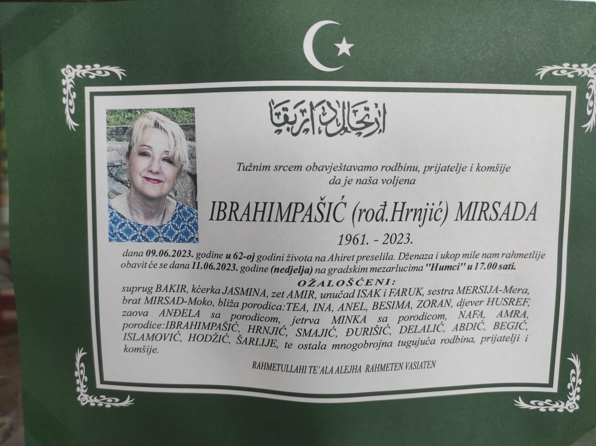 Tužnim srcem i bolom u duši javljamo rodbini, prijateljima i poznanicima da je naša draga Ibrahimpašić (rođ.Hrnjić) Mirsada, dana 09.06.2023 u 62-oj godini života.