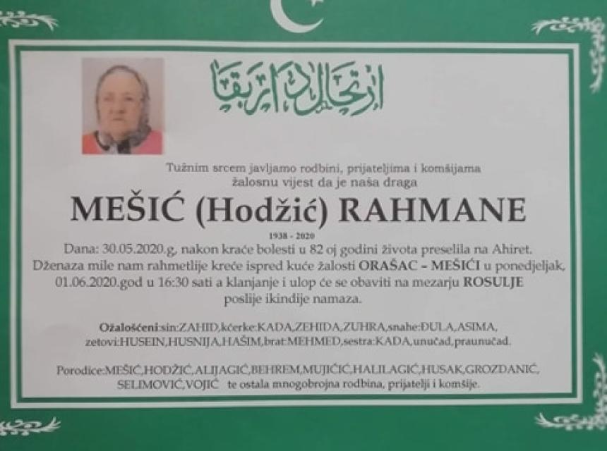 Dana 30.05.2020. u 82oj godini života preselila je na Ahiret Mešić Rahmane. Dženaza namaz polazi u ponedjeljak 01.06.2020. u 16:30 sati a klanjanje će biti obavljeno poslije ikindije namaza.
