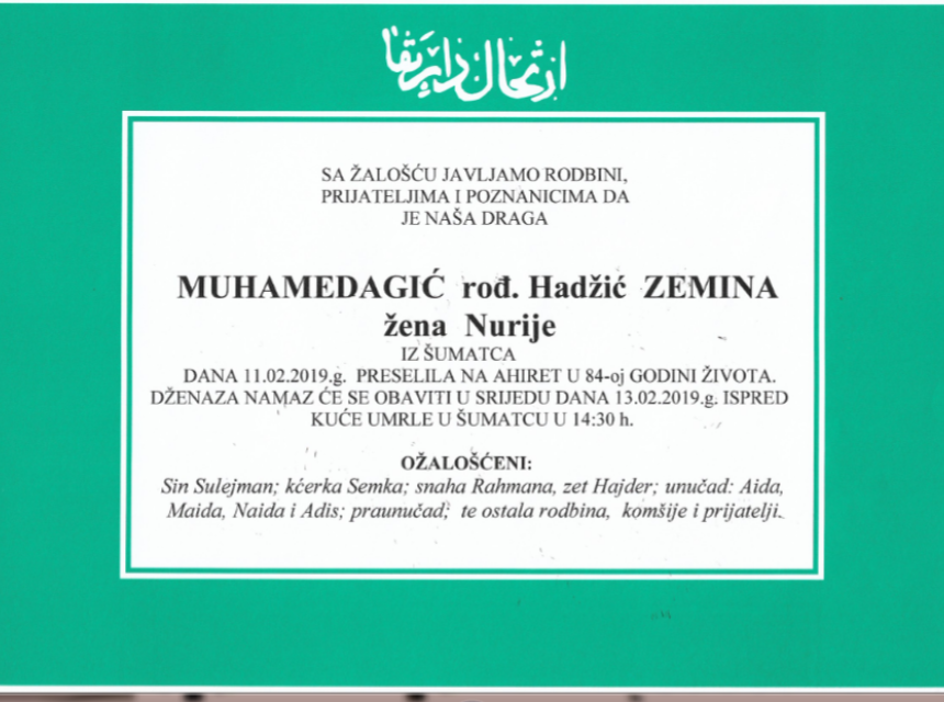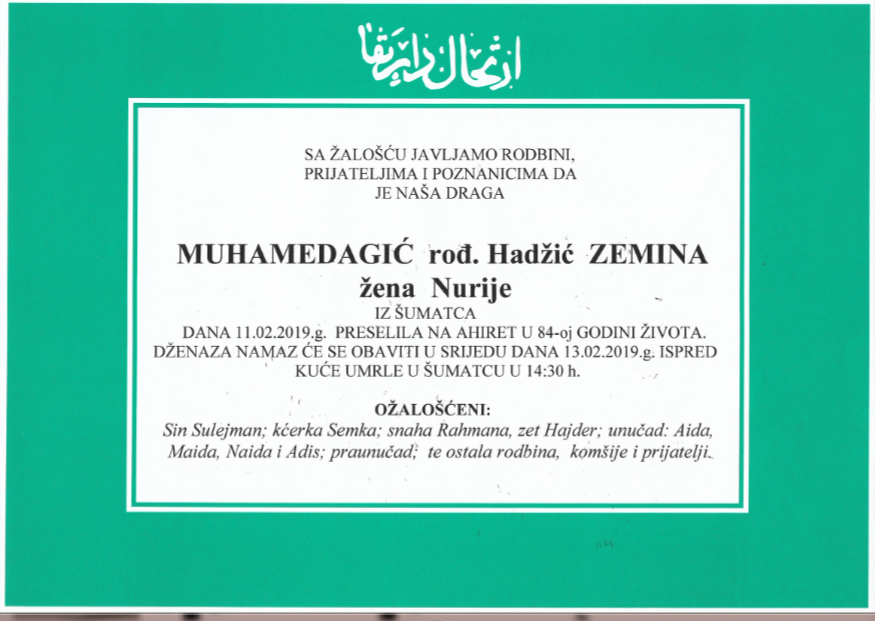 Sa žalošću javljamo rodbini, prijateljima i poznanicima da je naša draga Muhamedagić (Hadžić) Zemina žena Nurije iz Šumatica, dana 11.02.2019. godine preselila na Ahiret u 84. godini života.Dženaza namaz će se obaviti u srijedu dana 13.02.2019. godine ispred kuće umrle u Šumatcu u 14:30 sati.