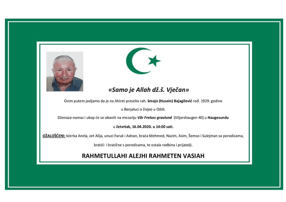 Dženaza namaz i ukop polazi na mezarju Var Frelses gravlundb u Haugesundu u četvrtak 16.04.2020. u 14:00 sati.