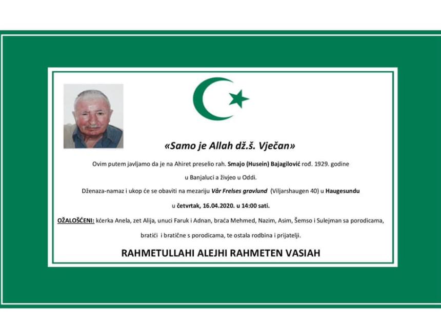 na Ahiret je preselio Bajagilović (Husein) Smajo, rođen 1929.godine u Banja Luci a živio u Oddi.