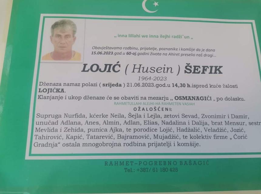 Dženaza polazi dana 21.06. 2023.g.(srijeda) u 14:30 sati ispred kuće umrlog na Lojićki.