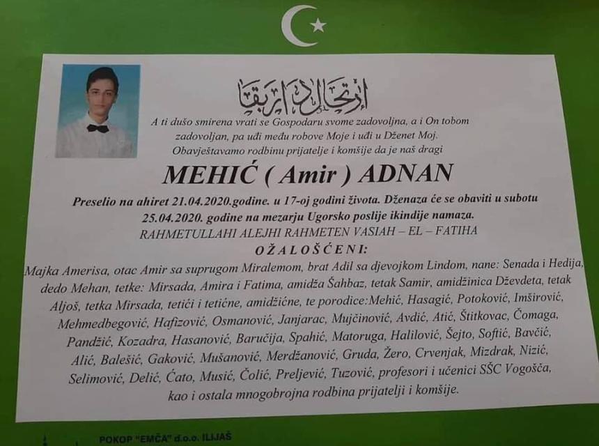 Dženaza namaz će se obaviti u subotu 25.04.2020.godine na mezarju Ugorsko poslije ikindije namaza.