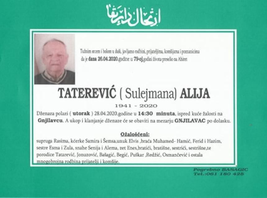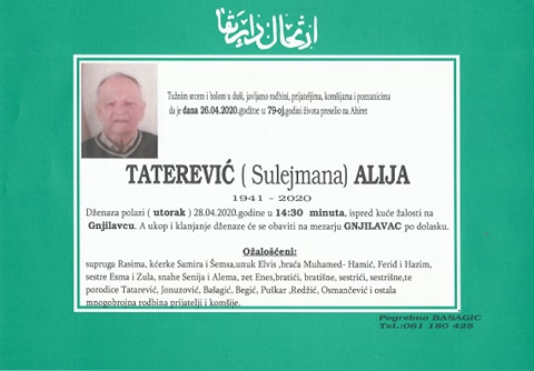 Tužnog srca i s bolom u duši obavještaamo rodbinu, komšije i prijatelje da je naš dragi Tatarević (Sulejmana) Alija, dana 26.04.2020. godine u 79- godini života preselio na Ahiret.