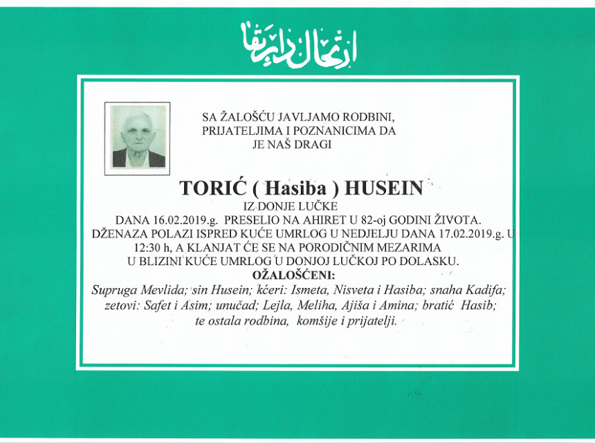 Sa žalošću javljamo prijateljima, rodbini i poznanicima da je naš dragi Torić (Hasiba) Husein iz Donje Lučke, dana 16.02.2019. godine preselio na Ahiret u 82. godini života. Dženaza polazi ispred kuće umrlog u nedjelju dana 17.02.2019. godine u 12:30 sati, a klanjat će se na porodičnim mezarima u blizini kuće umrlog u Donjoj Lučkoj po dolasku.