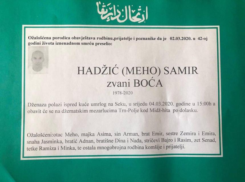 Tužnim srcem i bolom u duši javljamo rodbini i prijateljima da je naš dragi i nikad prežaljeni Hadžić (Meho) Samir zvani Boća dana 02.03.2020. godine u 42-oj godini života preselio na Ahiret.