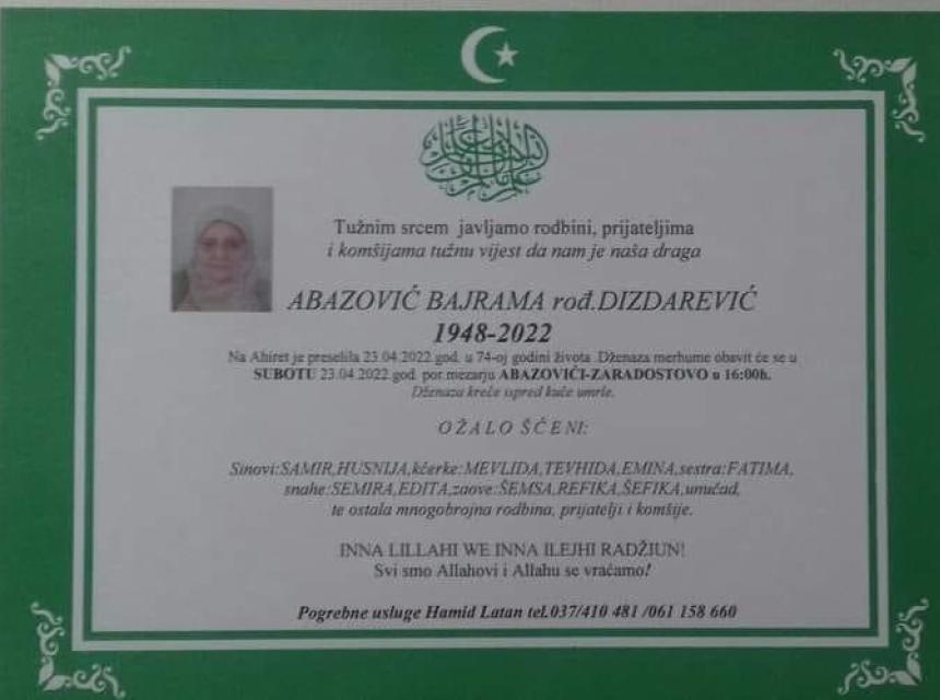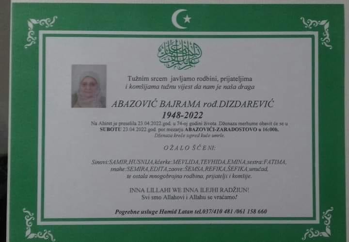Tužnog srca i s bolom u duši obavještavamo rodbinu, komšije i prijatelje da je naša draga Abazović (r. Dizdarević) Bajrama u 74. godini života preselila na Ahiret.