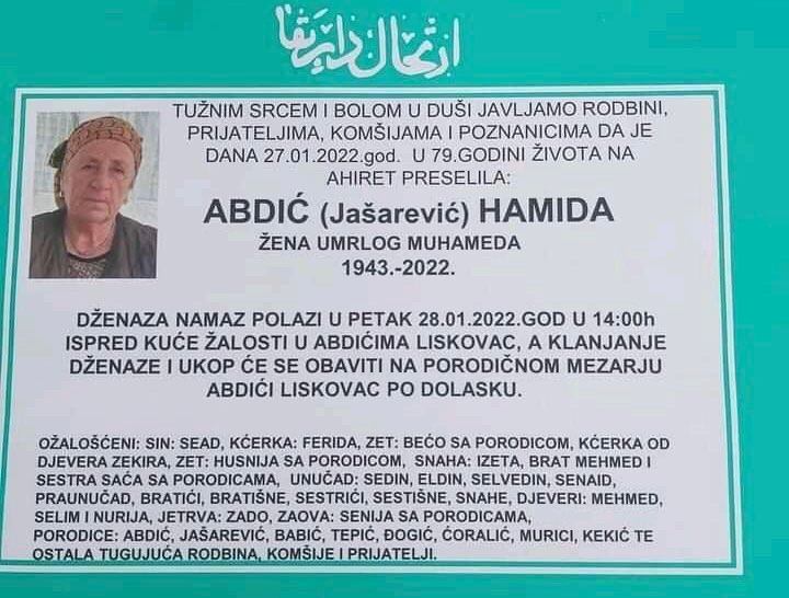 Tužnog srca i s bolom u duši obavještavamo rodbinu, komšije i prijatelje da je naša draga Abdić (Jašarević) Hamida, dana 27.01.2022. godine, u 79-oj godini života, preselila na Ahiret.