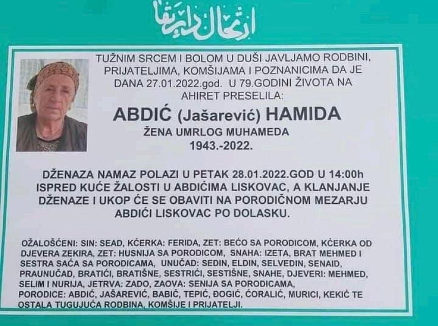 Dženaza namaz polazi u petak 28.01.2022. godine ispred kuće žalosti u Abdićima (Liskovac) u 14:00h, a klanjanje dženaze i ukop će se obaviti na porodičnom mezarju Abdići - Liskovac, po dolasku.