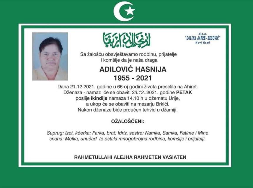 Tužnog srca i s bolom u duši obavještavamo rodbinu, komšije i prijatelje da je naša draga Adilović Hasnija, dana 21.12.2021. godine, u 66-oj godini života, preselila na Ahiret.