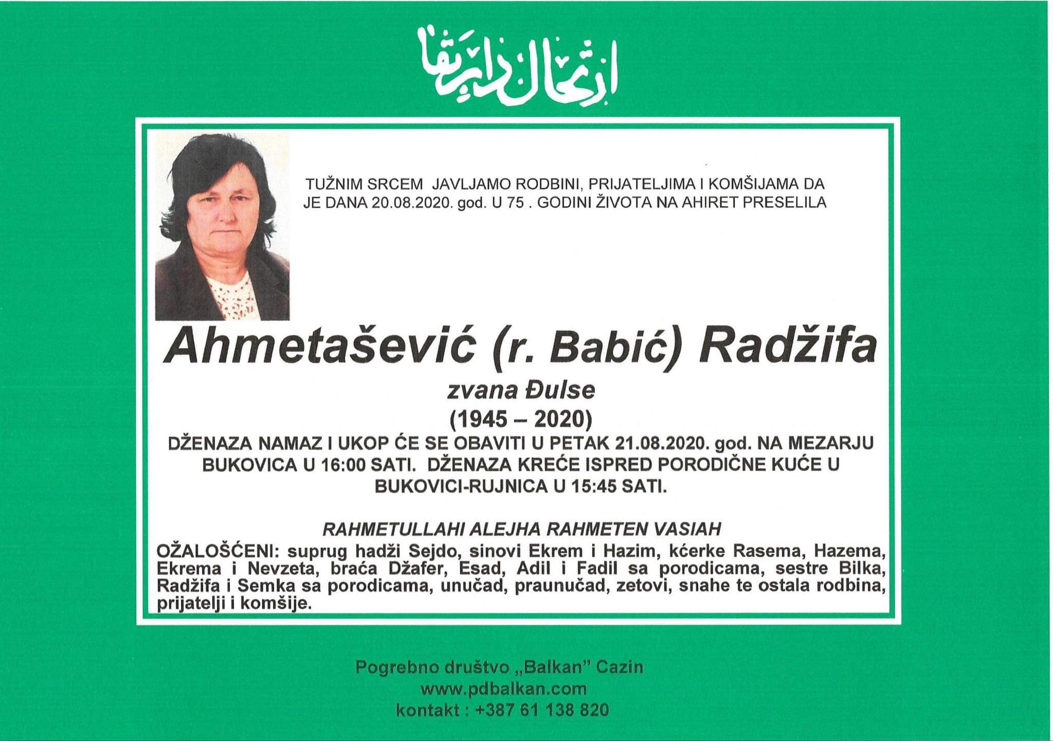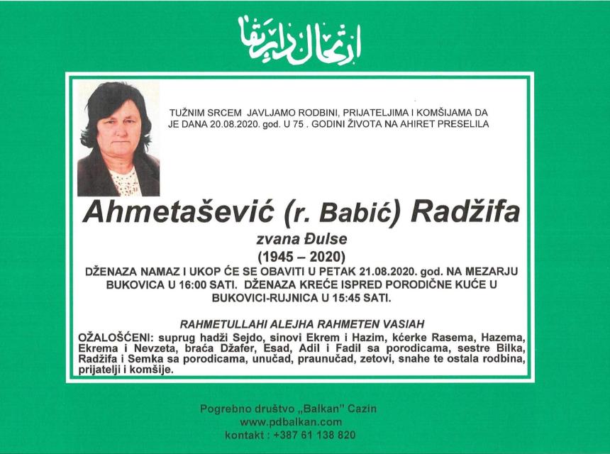 Tužnog srca i s bolom u duši obavještavamo rodbinu, komšije i prijatelje da je naša draga Ahmetašević (r. Babić) Radžifa, dana 20.08.2020. godine, u 75-oj. godini života ,preselila na Ahiret.
