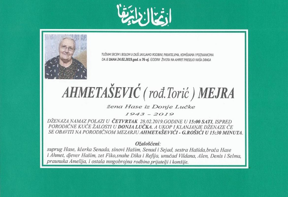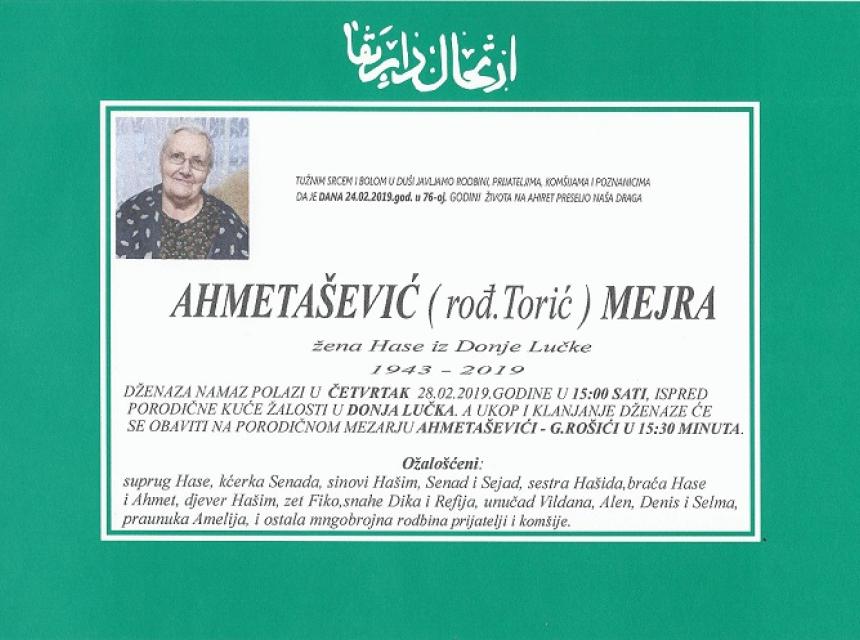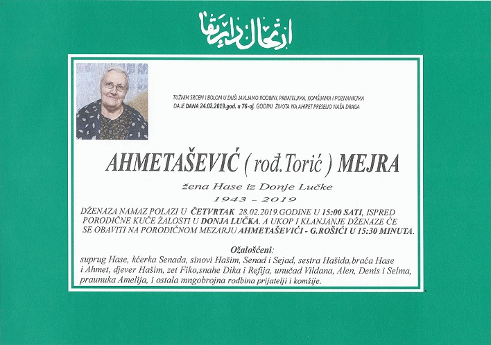 Tužnim srcem i bolom u duši javljamo rodbini, prijateljima, komšijama i poznanicima da je dana 24.02.2019. godine u 76-oj godini života na Ahiret preselila Ahmetašević (rođ.Torić) Mejra.