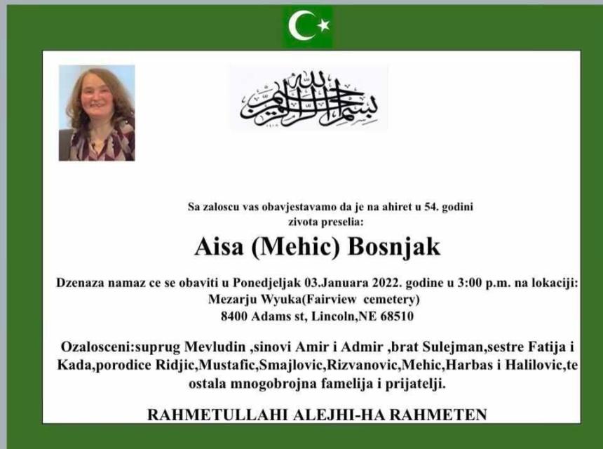 Sa žalošću vas obavještavamo da je u 54. godini na Ahiret preselila Aisa (Mehić) Bošnjak. Dženaza namaz će se obaviti u ponedjeljak 3.1.2022. godine u 15h na lokaciji: Mezarje Wyuka ( Fairview cemetery ) 8400 Adams st, Lincoln, NE 68510.