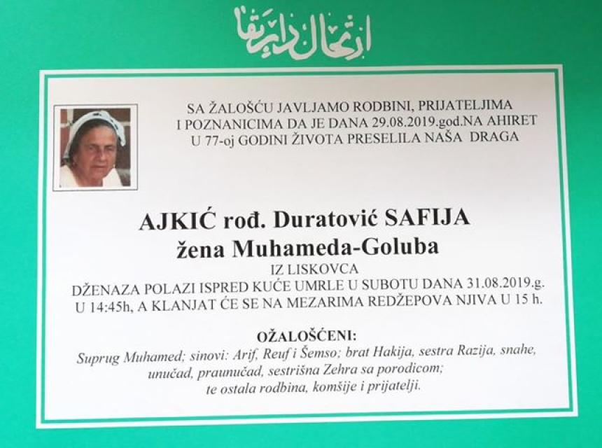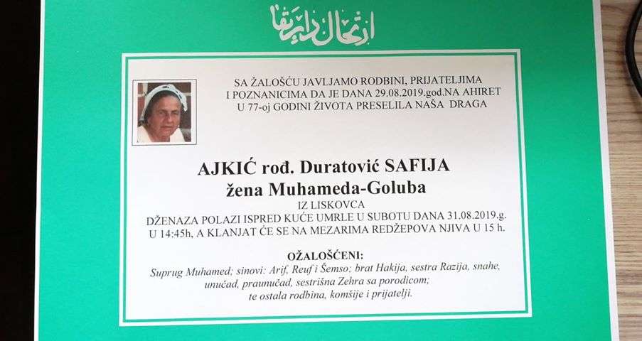 Sa žalošću javljamo rodbini, prijateljima i poznanicima da je dana 29.08.2019. godine na Ahiret u 77-oj godini života preselila naša draga Ajkić (rođ. Duratović) Safija, žena Muhameda-Goluba iz Liskovca.