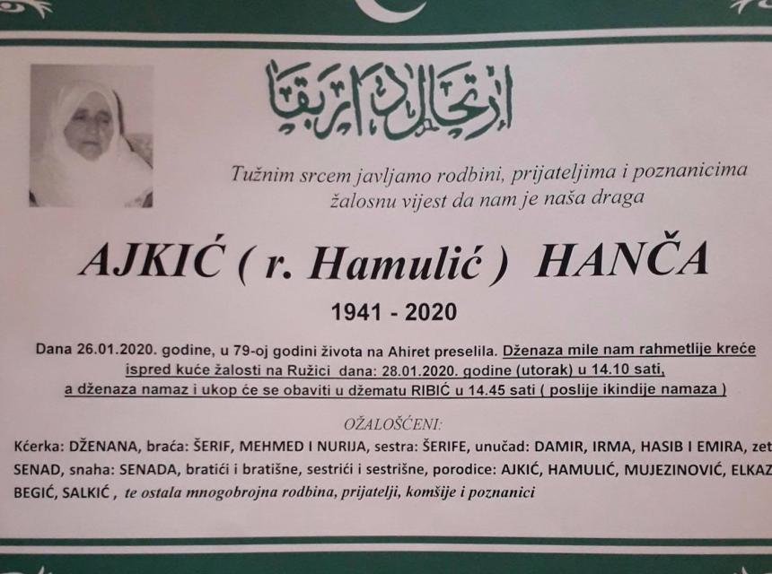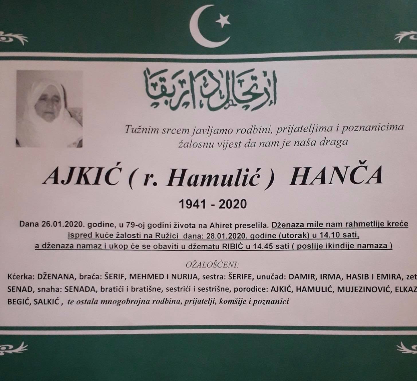 Tužnim srcem i bolom u duši javljamo rodbini, komšijama i prijateljima da je naša draga Ajkić (r. Hamulić) Hanča preselila na Ahiret dana 26.01.2020. godine.