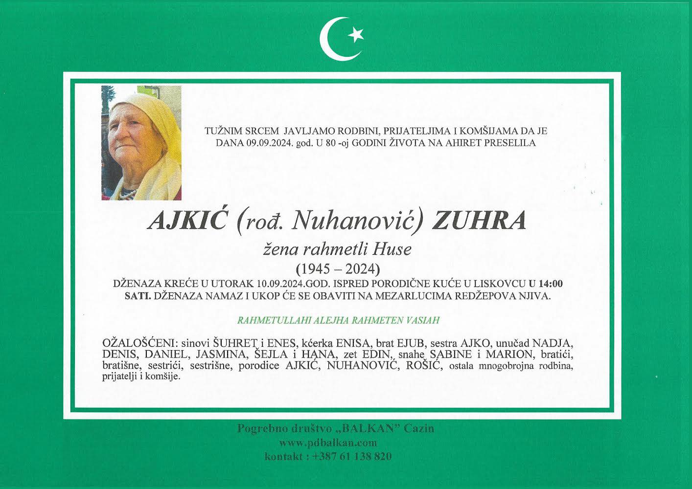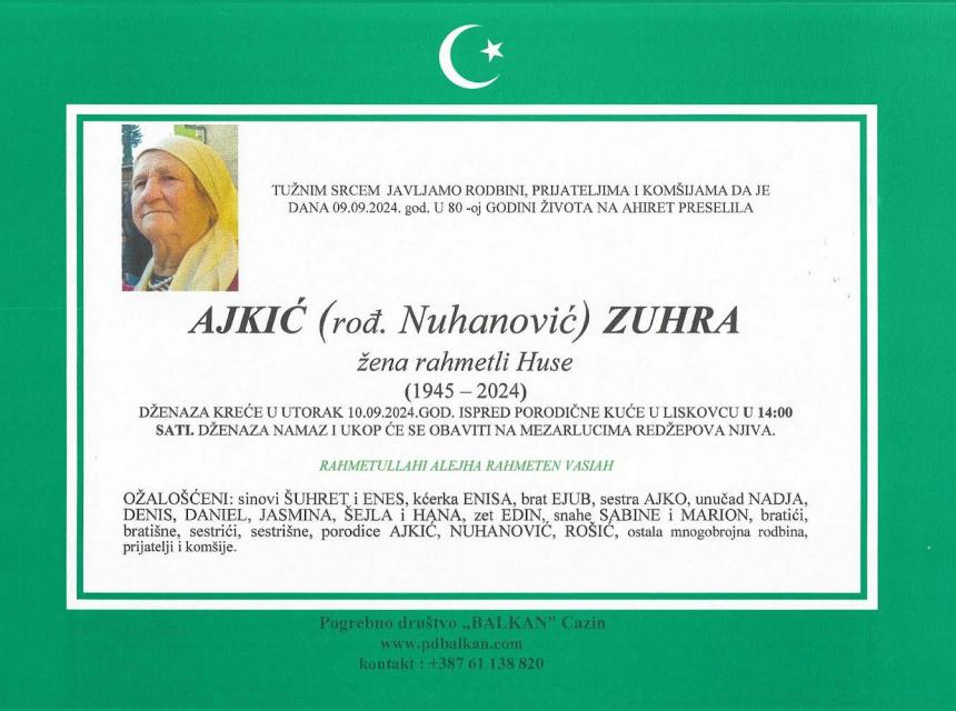 Tužnim srcem i bolom u duši javljamo rodbini, prijateljima i komšijama da je naša draga AJKIĆ (rođ. Nuhanović) ZUHRA, dana 09.09.2024. godine u 80-oj godini života, preselila na ahiret.