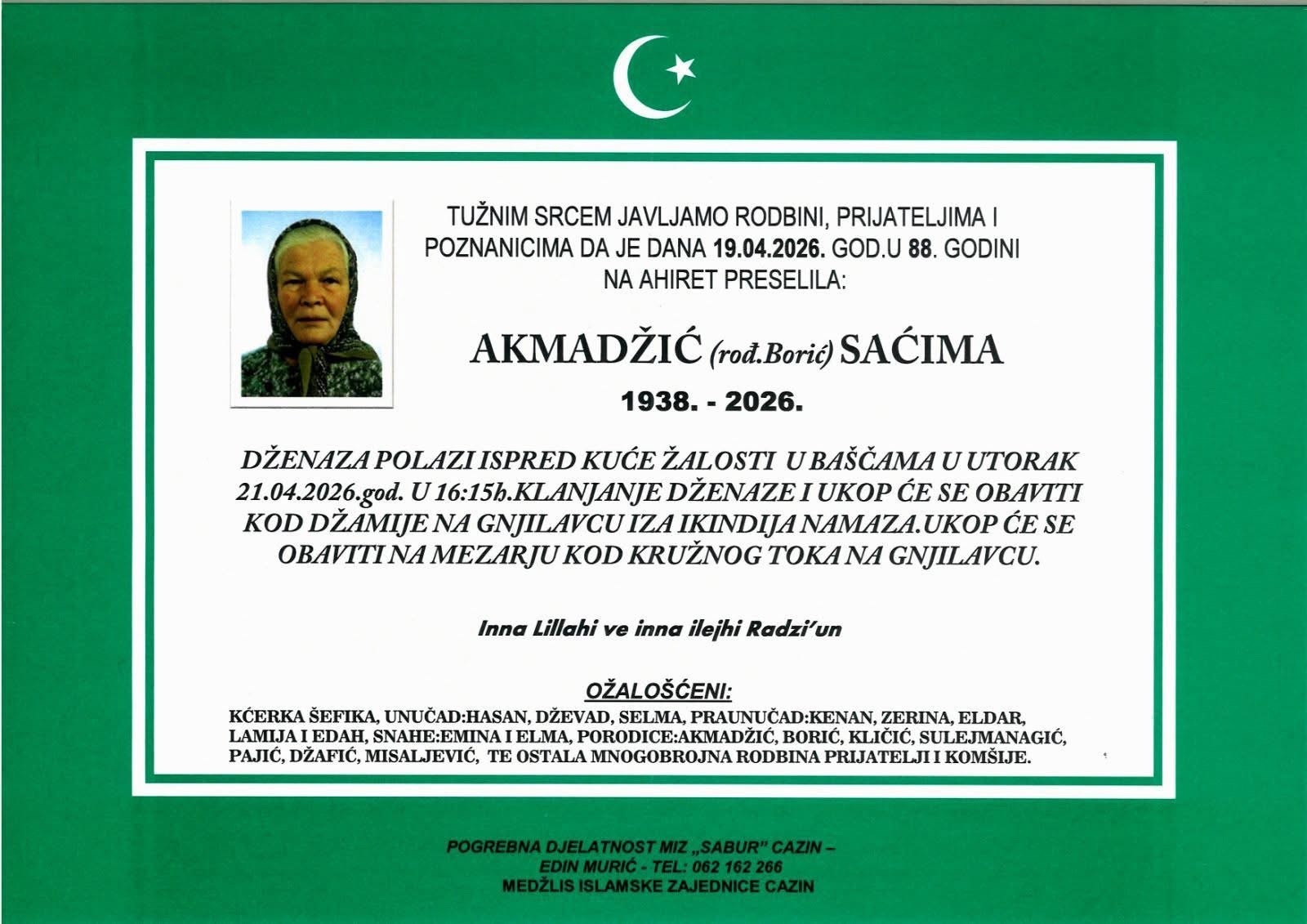 Tužnim srcem javljamo rodbini, prijateljima i poznanicima da je dana 19.04.2026. godine, u 88. godini, na Ahiret preselila: