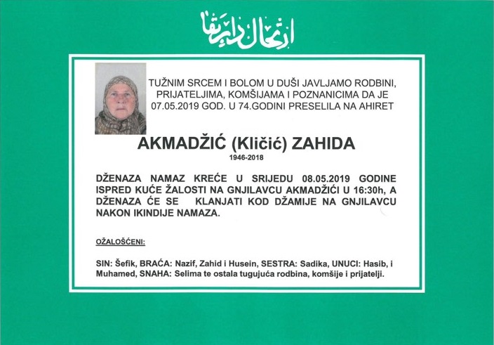Tužnim srcem i bolom u duši javljamo rodbini, prijateljima, komšijama i poznanicima da je dana 07.05.2019. godine u 74. godini života na Ahiret preselila Akmadžić (rođ.Kličić) Zahida.