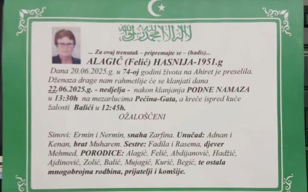 Tužnim srcem javljamo rodbini, prijateljima i poznanicima da je dana 20.06.2025. godine u 74. godini života, na ahiret preselila Alagić (Felić) Hasnija.