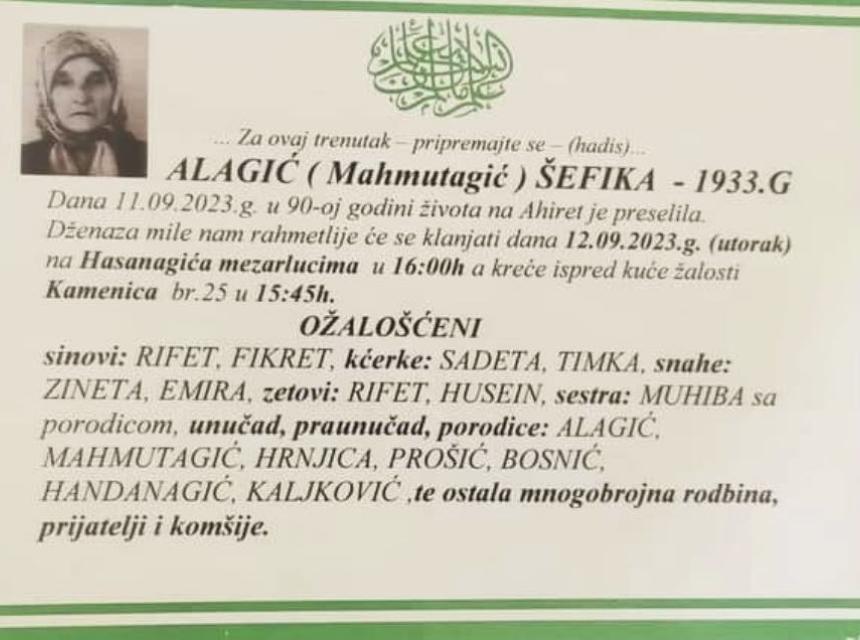 Dana 11.09.2023.g. u 90-oj godini života na Ahiret je preselila Alagić (Mahmutagić) Šefika.