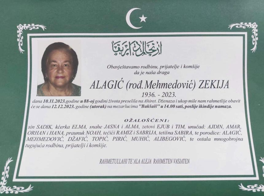 Obavjestavamo rodbinu, prijatelje komsije da je nasa draga Alagić (Mehmedović) Zekija, dana 10.11.2023. , u 88-oj godini zivota preselila na Ahiret.