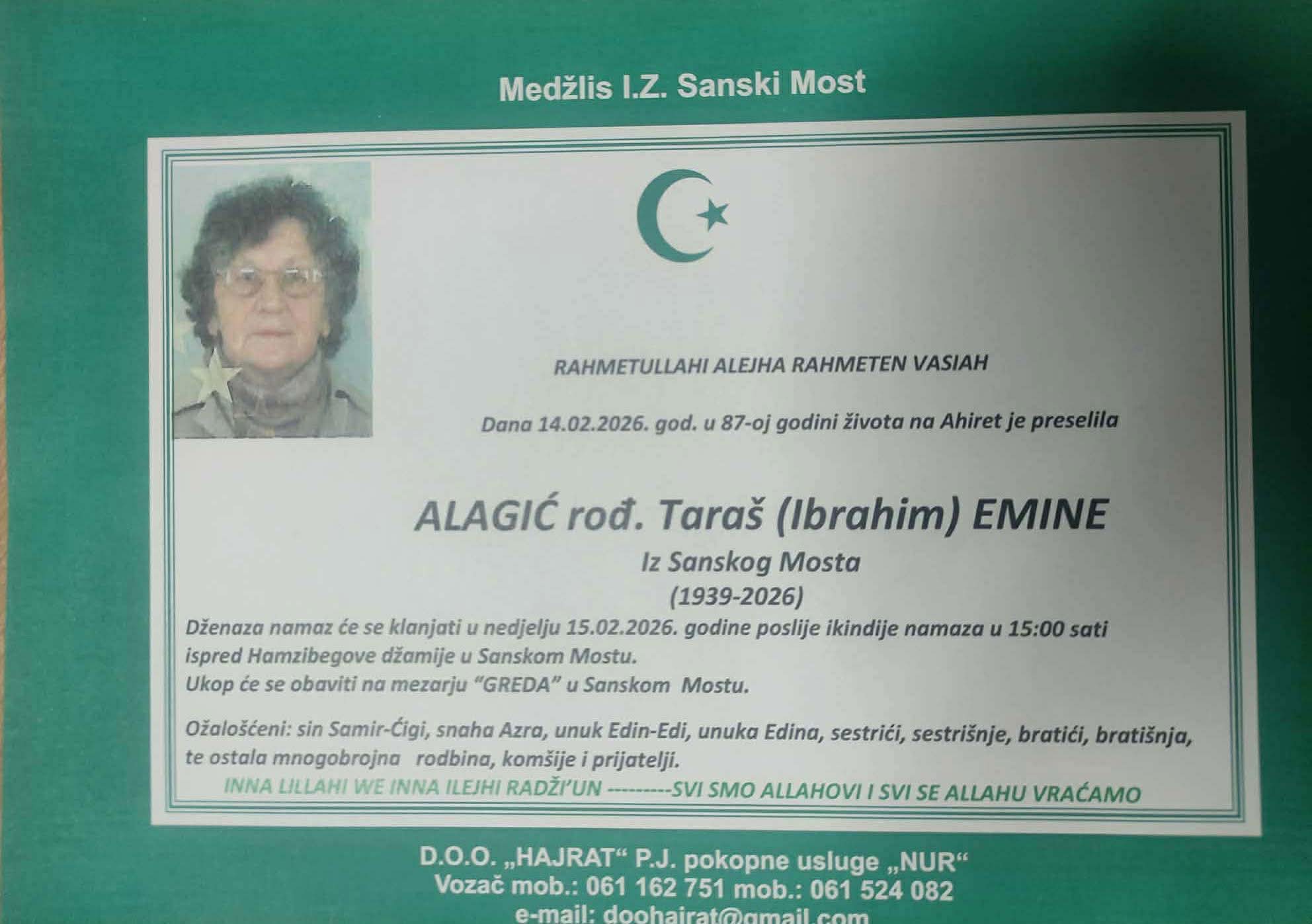 Dženaza namaz će se klanjati u nedjelju 15.02.2026. godine poslije ikindije namaza u 15:00 sati ispred Hamzibegove džamije u Sanskom Mostu.