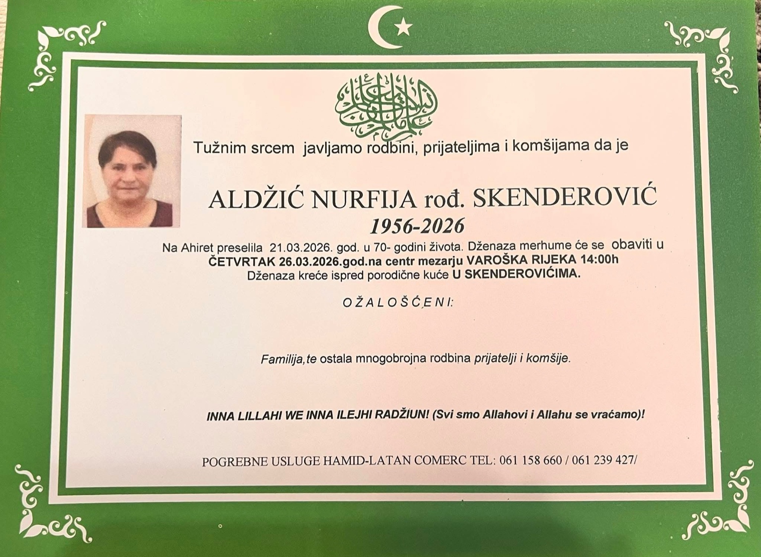 Na Ahiret preselila 21.03.2026. godine u 70. godini života. Dženaza merhume će se obaviti u četvrtak, 26.03.2026. godine, na centralnom mezarju Varoška Rijeka u 14:00 sati.