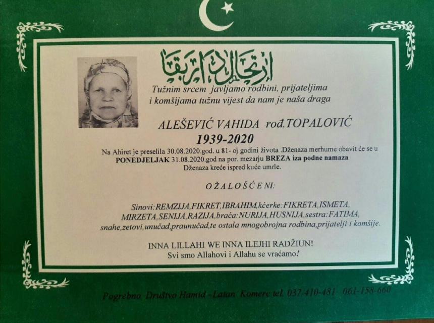 Tužnog srca i s bolom u duši obavještavamo rodbinu, komšije i prijatelje da je naša draga Alešević (rođ. Topalović) Vahida, dana 30.08.2020. godine, u 81-oj. godini života, preselila na Ahiret.