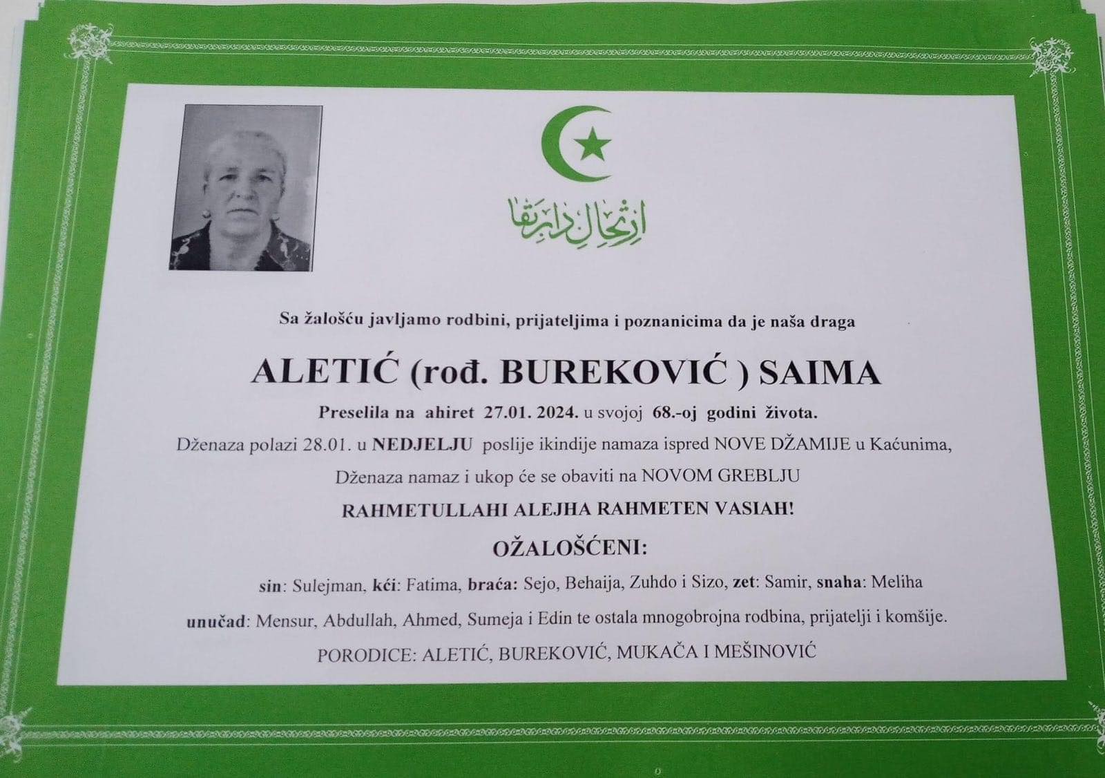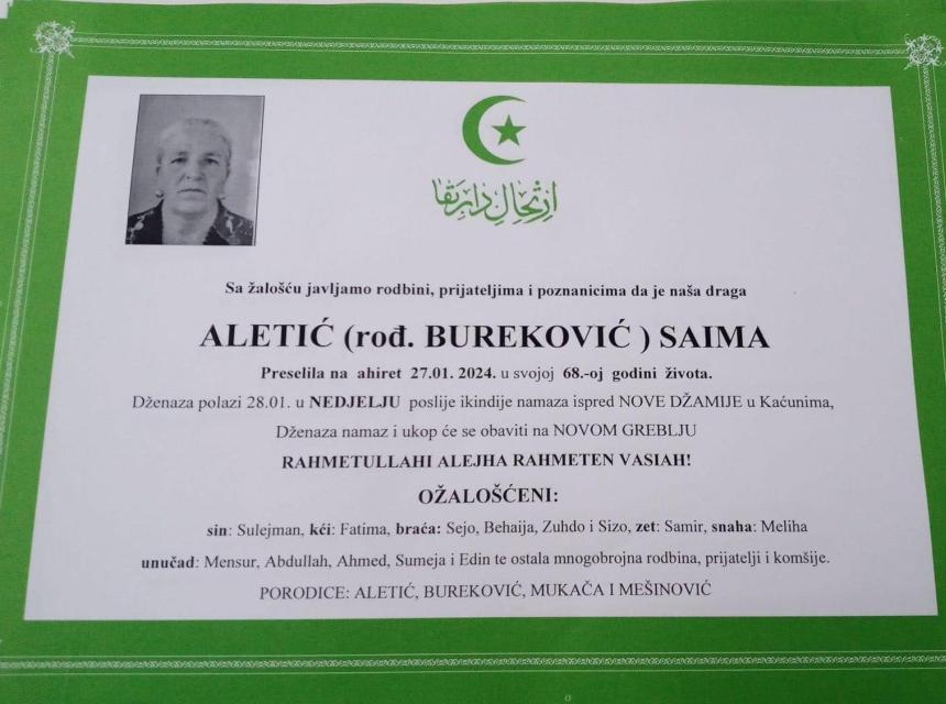 Tužnim srcem javljamo rodbini, prijateljima i komšijama da je u 27.01.2024. god u 68. godini života na Ahiret preselila Aletić (rođ. Bureković) Saima.