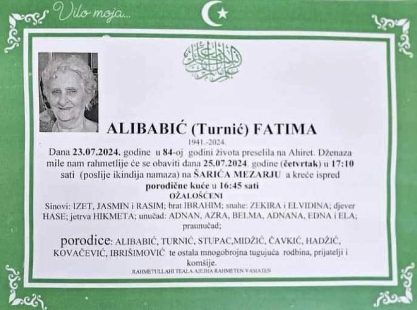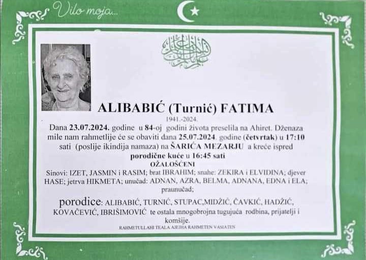 Tužnim srcem i bolom u duši javljamo rodbini, prijateljima i komšijama da je naša draga Alibabić (Turnić) Fatima, dana 23.07.2024. godine u 84-oj godini života, preselila na Ahiret.