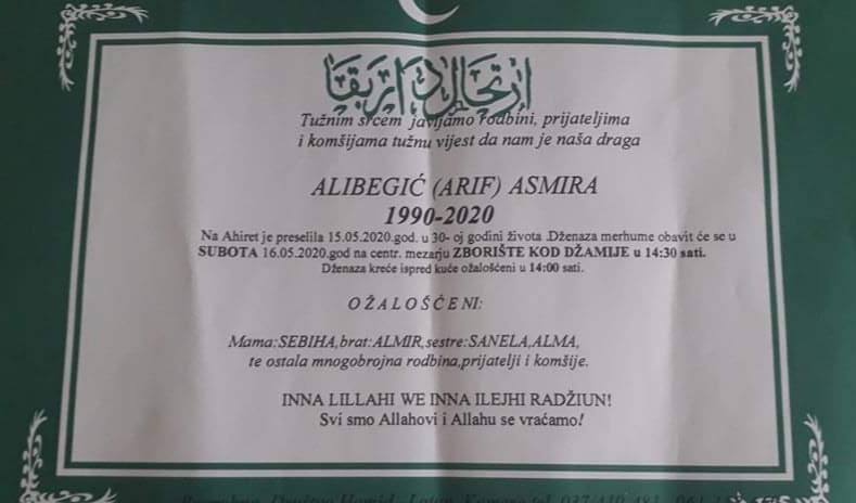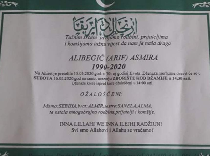 Tužnim srcem i bolom u duši javljamo rodbini i prijateljima da je naša draga i nikad prežaljena Alibegić (Arif) Asmira dana 15.05.2020. godine u 30-toj godini života preselila na Ahiret.