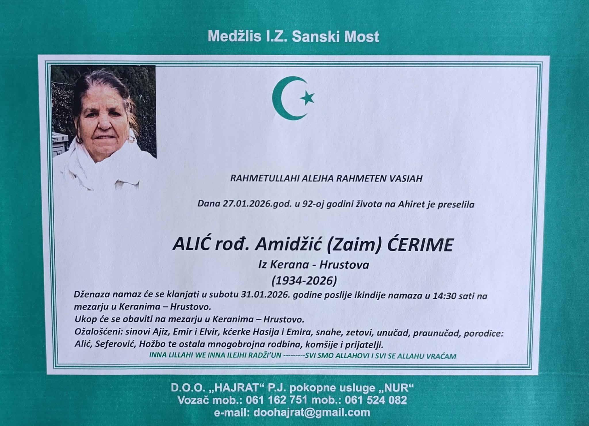 Dženaza-namaz će se klanjati u subotu, 31.01.2026. godine, poslije ikindije-namaza u 14:30 sati na mezarju u Keranima – Hrustovo.
