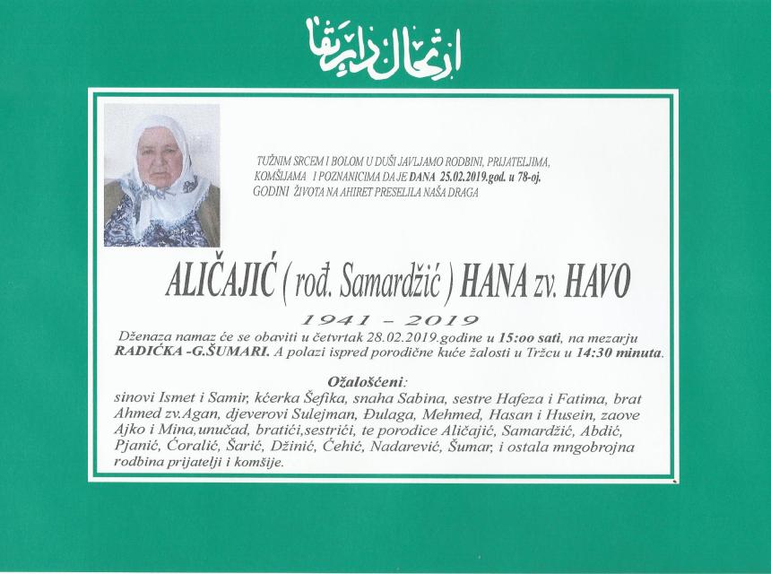Tužnim srcem i bolom u duši, javljamo rodbini, komšijama i prijateljima, da je na Ahiret 25.02.2019.g. u 78.-oj godini života preselila Aličajić (rođeno Samradžić) Hana, zvana Havo.