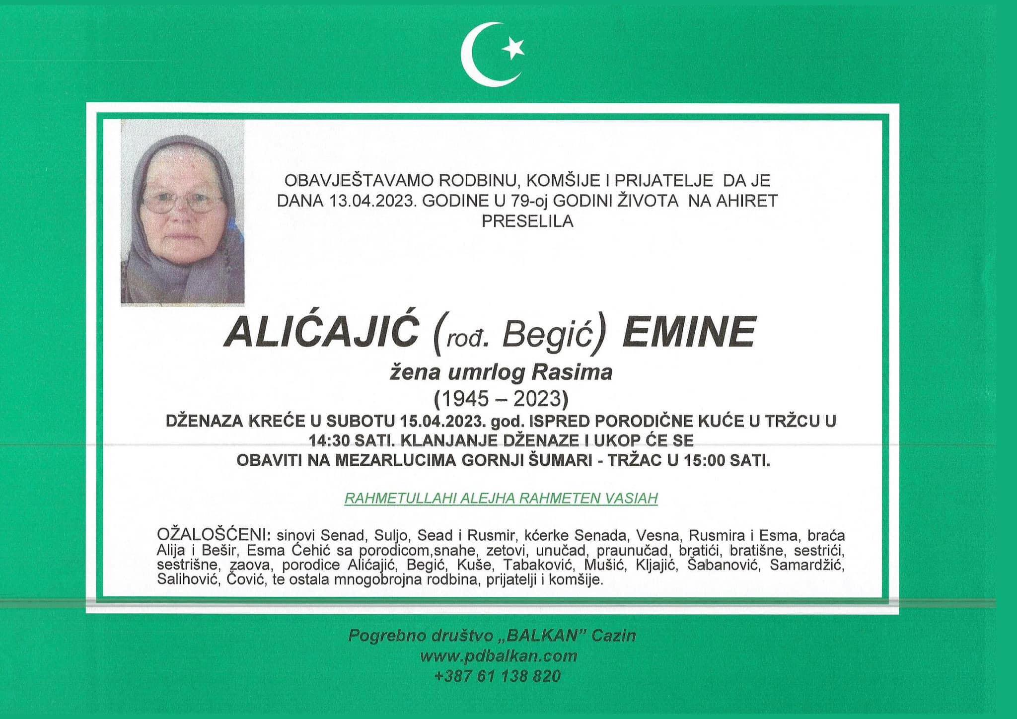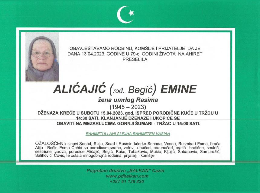 Tužnim srcem javljamo rodbini, prijateljima i poznanicima tužnu vijest da nam je naša draga Alićajić (rođ. Begić) Emine na Ahiret preselila dana 03.04.2023. godine u 79-oj godini.