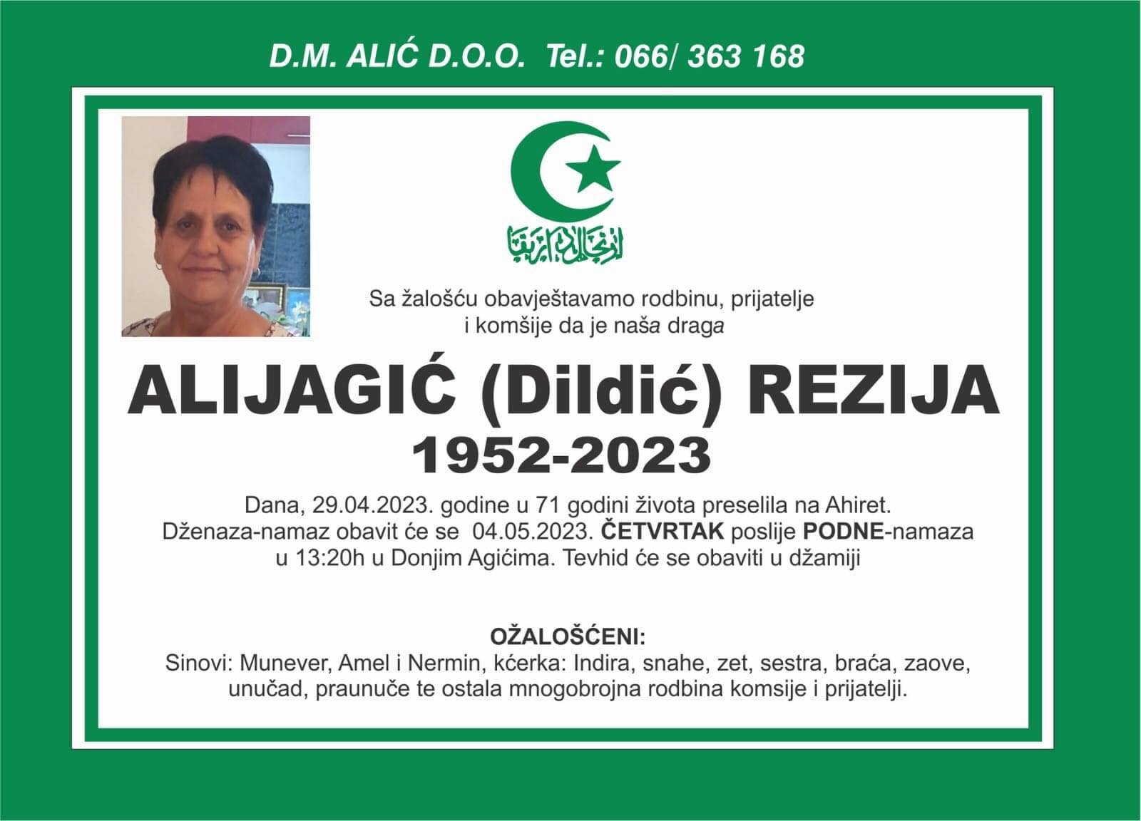 Tužnim srcem i bolom u duši javljamo rodbini, prijateljima i komšijama da je naša draga Alijagić (Dildić) Rezija, dana 29.04.2023. godine u 71-oj godini života, preselila na Ahiret.