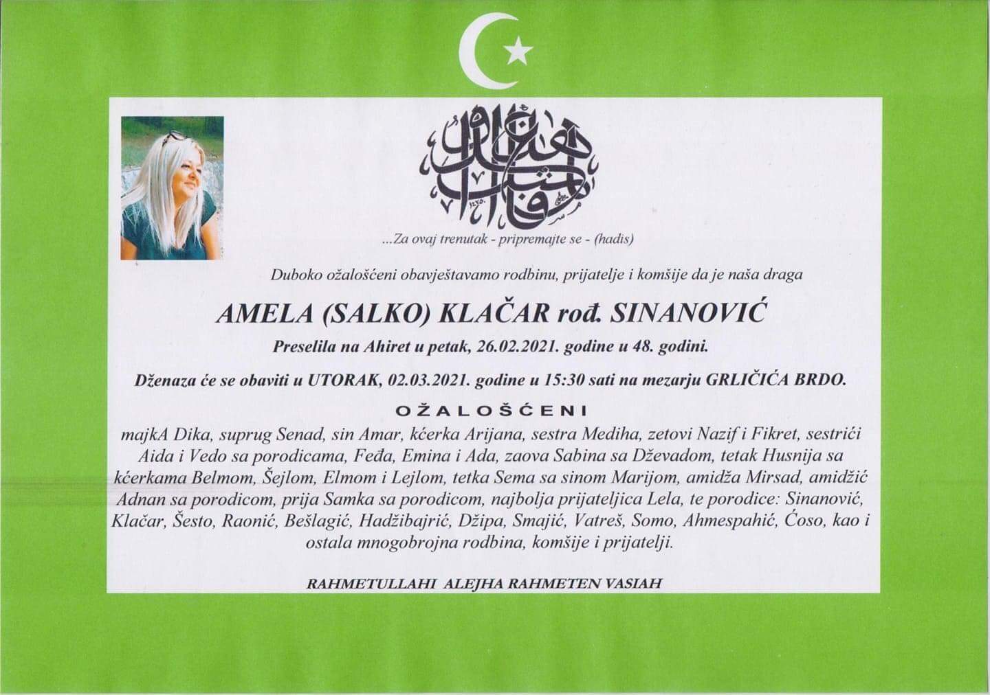 Tužnog srca i s bolom u duši obavještavamo rodbinu, komšije i prijatelje da je naša draga Amela (Salko) Klačar rođ. Sinanović, dana 26.02.2021. godine, u 48-oj. godini života, preselila na Ahiret.
