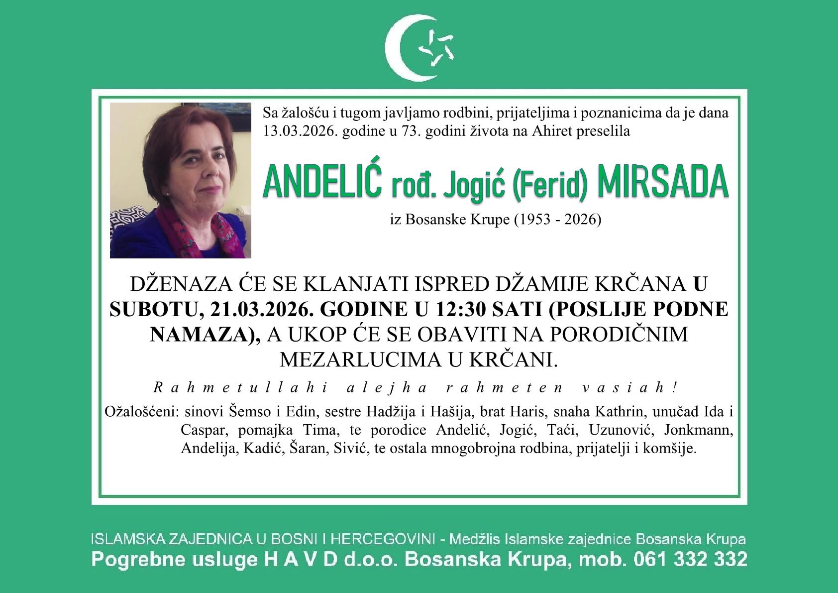 Dženaza će se klanjati ispred džamije Krčana u subotu, 21.03.2026. godine u 12:30 sati (poslije podne namaza), a ukop će se obaviti na porodičnim mezarlucima u Krčani.
