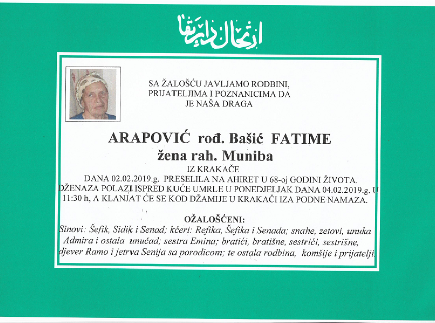 Javljamo rodbini, prijateljima i poznanicima da je dana 02.02.2019.g. u 68-oj godini života na Ahiret preselila Arapović rođ. Bašić Fatime.
